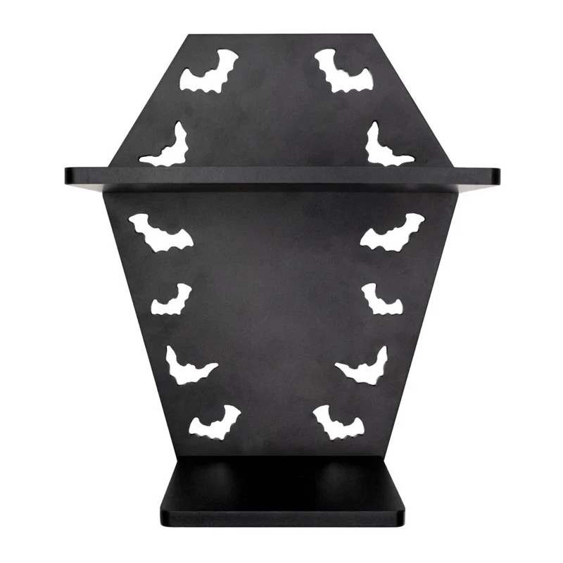 Haunted by boring home decor? Add some spooky flair to your vampire dwelling with the Bat Coffin Mini Shelf Kit by Kreepsville. Perfect for displaying ghoulish trinkets, toys, and knick-knacks, this floating shelf features a macabre coffin as the backing with flying bat cutouts and two shelves. Shelves measure approximately 9 in. (23 cm) L x 4.5 in. (11.5 cm) W and 5.25 in. (13 cm) L x 4.5 in. (11.5 cm) W. Shelves are constructed with wood with a black satin finish.