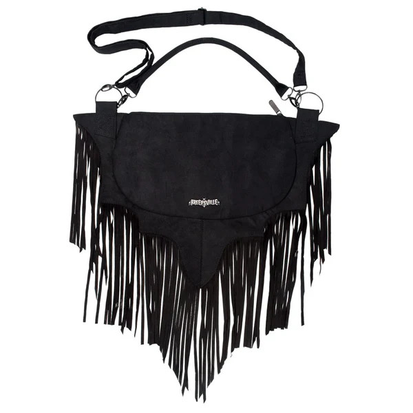 Kreepsville 666 bat wing fringe shoulder purse bag with detachable chain detail shoulder strap. Also includes a detachable and adjustable long shoulder strap to turn it instantly into a crossbody purse bag. Made from vegan suede. Features Kreepsville grey and black lining, inside pockets with a Kreepsville logo badge on the front, and 9-inch fringe. Overall bag size approximately 21 in. (53 cm) W x 13.75 in. (35 cm) H. Internal bag size 14 in. (35.5 cm) W x 8.5 in. (21.5 cm) H.
