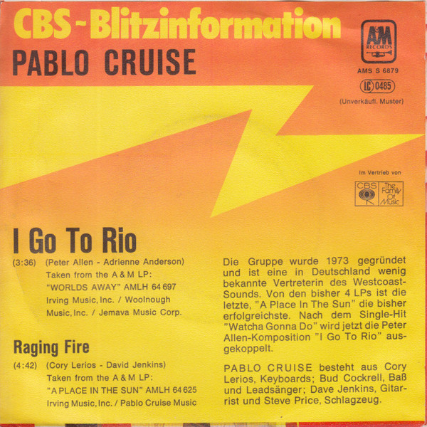 Pablo Cruise - I Go To Rio - Raging Fire * Used 7" Vinyl