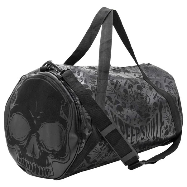Add some spooky skeletal style to your every day travels with the Skull Barrel Bag in black by Kreepsville. Turn heads with this large duffel bag complete with black vinyl print anatomical skull on both ends, black vinyl print death repeat all over design, and Kreepville logo on both sides.