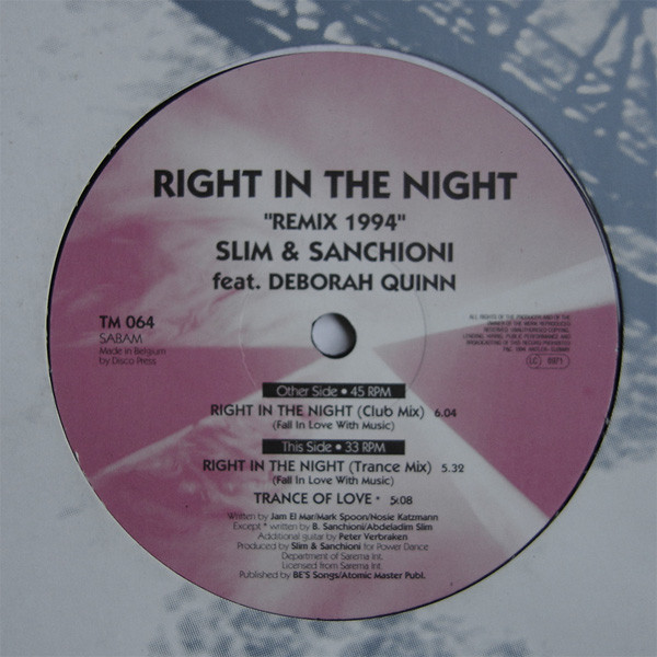 Tracklist: A Right In The Night (Fall In Love With Music) (Club Mix) | B1 Right In The Night (Fall In Love With Music) (Trance Mix) | B2 Trance Of Love